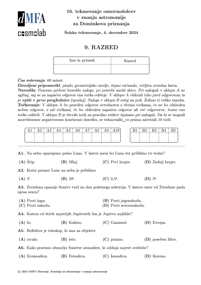 Vzorec nalog iz lanskega tekmovanja v astronomiji